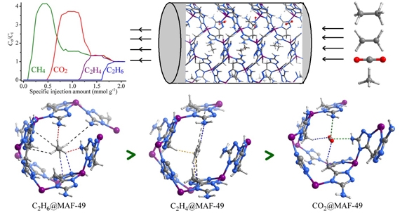 对于分子量相似的碳氢化合物,绝大多数多孔材料(亲水性)会选择性地吸附极性更大、分子更小和具有配位能力的烯烃。但是,这些多孔材料对不饱和烯烃的吸附选择性通常不够高,同时这种选择性意味着烯烃被吸附剂保留,需要多个吸附脱附循环才能达到目标纯度。虽然疏水多孔材料可以实现“反转”的乙烷/乙烯吸附选择性,理论上可以仅通过一次吸附过程得到纯化的乙烯,但这两种气体亲疏水性差别极小,因而分离效果可忽略。为此,研究团队提出了“亲水孔道捕获疏水分子”的概念,利用超微孔表面精确排列的氢键受体,高效结合极性较低的乙烷分子而非极性较大的乙烯分子,并据此合成了新型多孔配位聚合物MAF-49。常温常压下,将乙烯/乙烷混合物通过MAF-49填充的固定床吸附装置后,乙烷被选择性吸附保留,流出的乙烯纯度很容易超过99.99%(Nat. Commun. 2015, 6, 8697)。